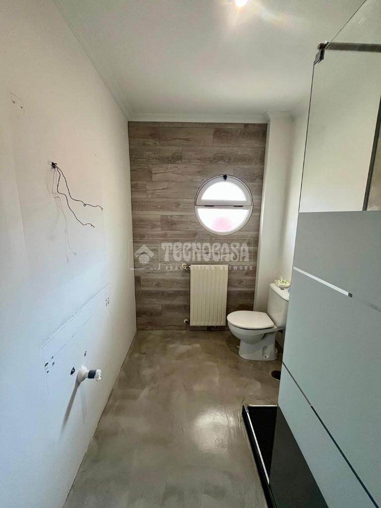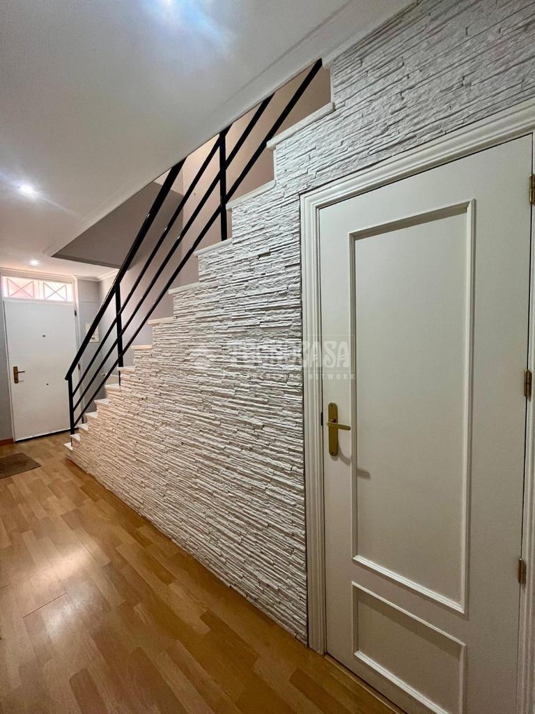 En la primera planta, el dormitorio matrimonial destaca por su salida a una terraza privada, ideal para disfrutar del sol de la mañana. También hay otro dormitorio amplio y luminoso que también tiene acceso a la terraza, además de un tercer dormitorio individual y un baño completo con ventana. Las ventanas climalit en blanco y las puertas de pino lacadas aportan un toque moderno y acogedor a la vivienda.